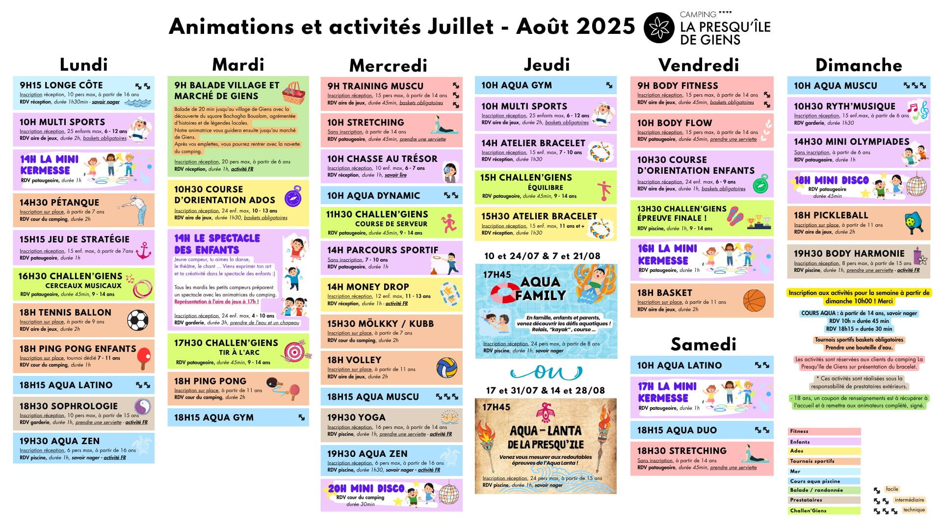 Das Programm wird mit rund fünfzig Veranstaltungen pro Woche noch umfangreicher. Auf dem Campingplatz La Presqu’île de Giens legen wir Wert auf gesellige und familienfreundliche Veranstaltungen für alle Altersgruppen (Kinder, Jugendliche, Erwachsene), damit Sie mit Freunden oder der Familie Spaß haben können!